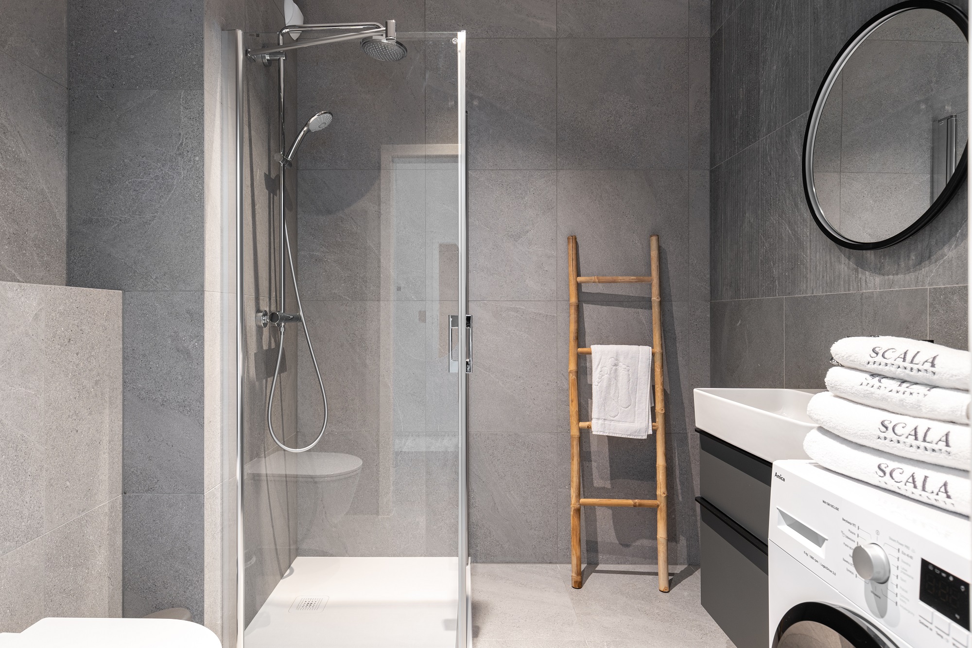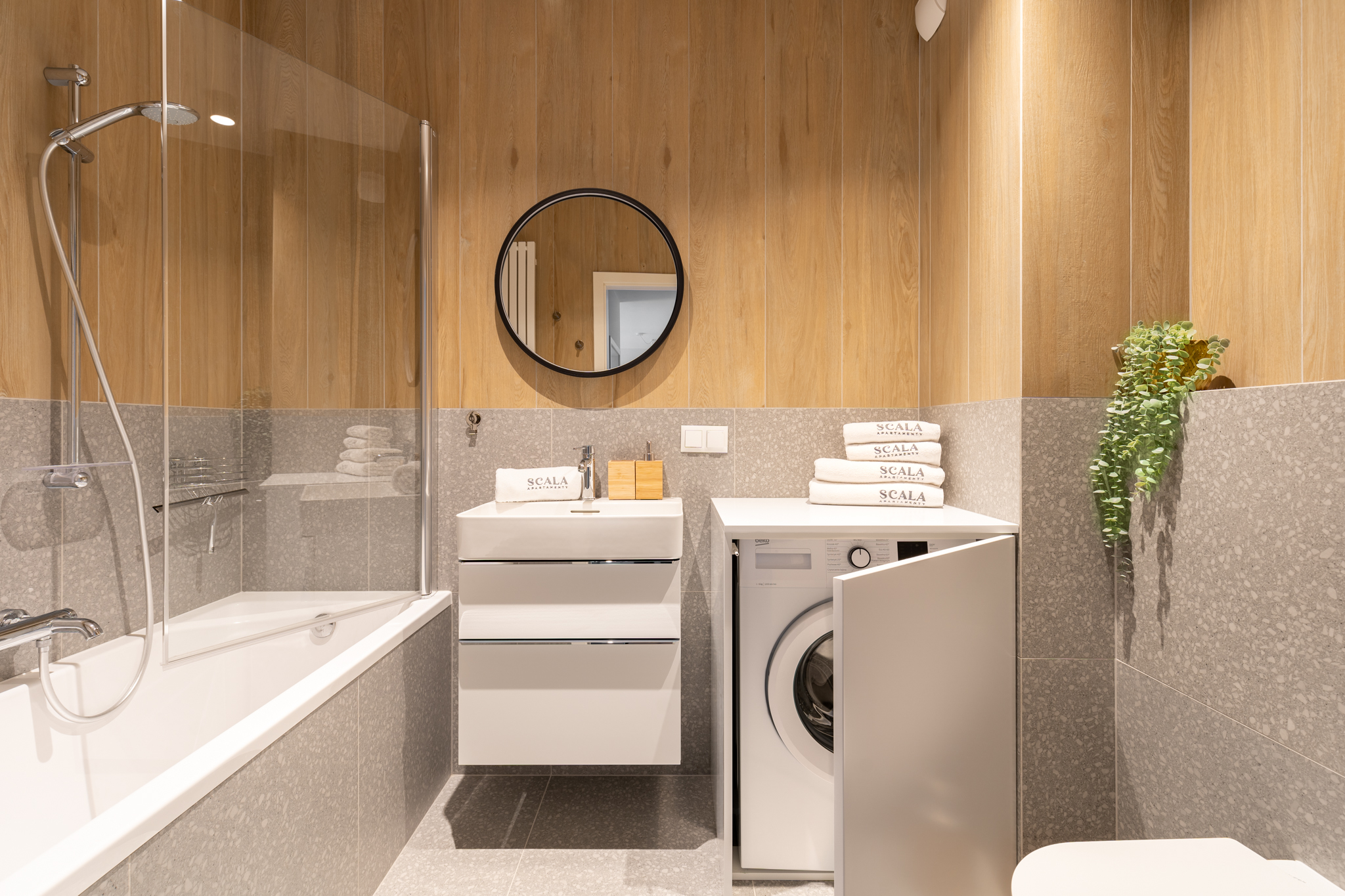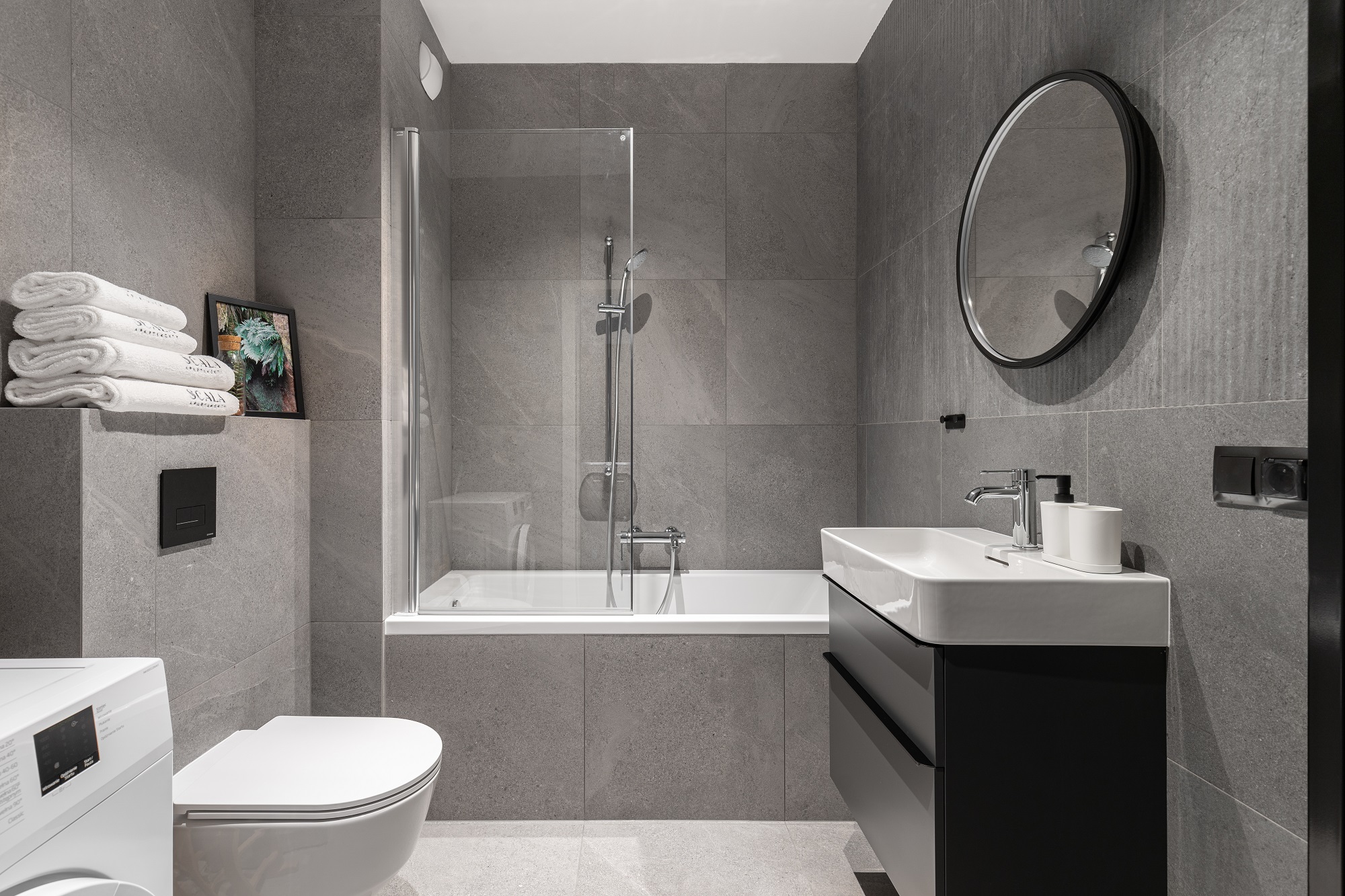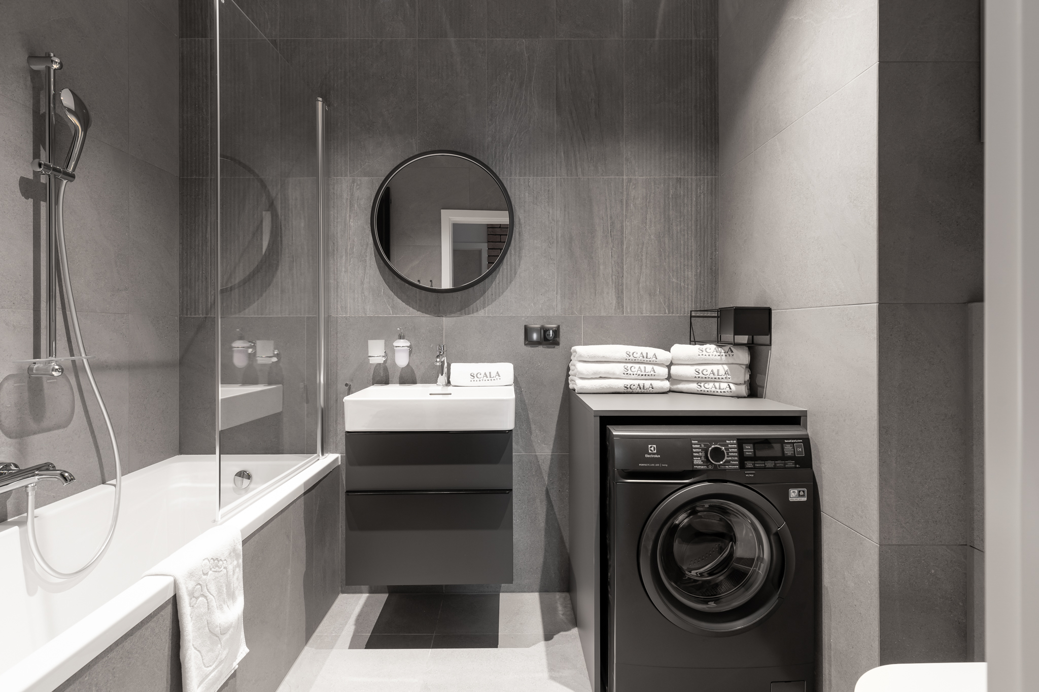 Do najnowocześniejszych elementów dołączyły kompletne brodziki oraz wanny Laufen PRO, miski wc podwieszane bezkołnierzowe z serii PRO, umywalki wiszące z kolekcji VAL i SONAR – dobrane odpowiednio ze względu na lekkie piękno zaokrąglonych linii i oryginalność kształtów.