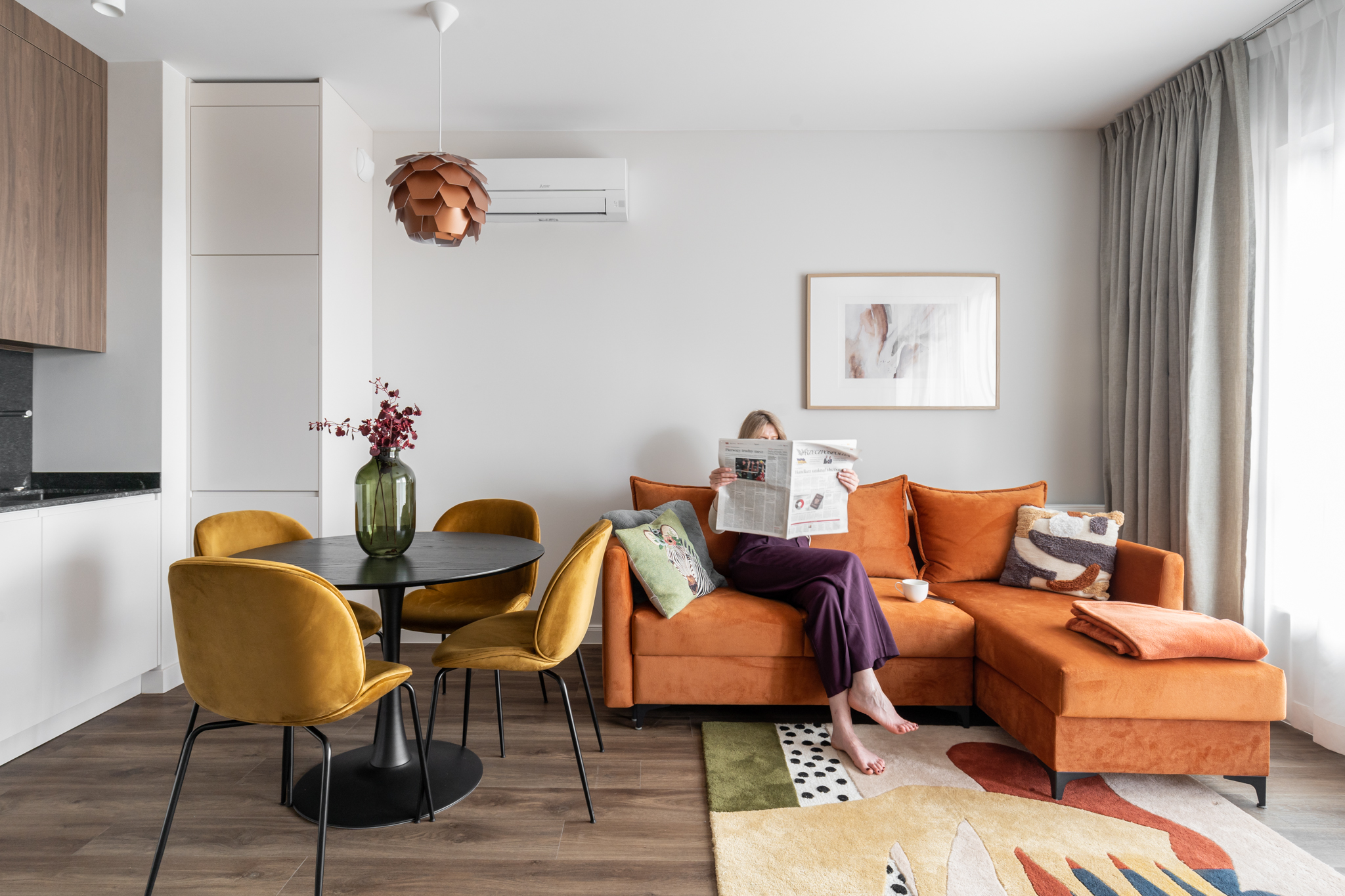 Moderna oferuje kompletne apartamenty z umeblowaną i wyposażoną kuchnią i łazienką w trzech wyróżniających się stylach: Eleganckim, Skandynawskim i Klasycznym.