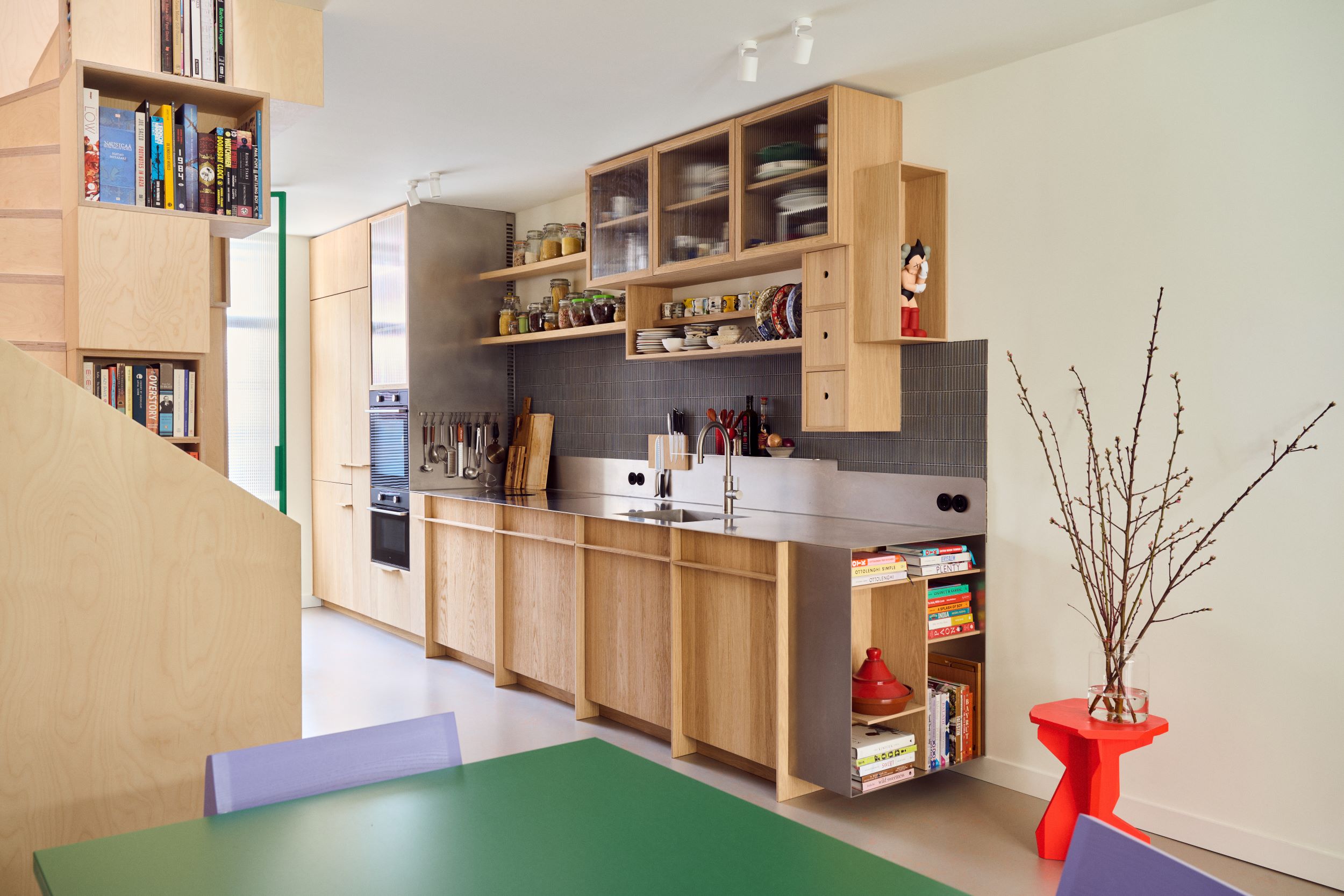 W bliskiej współpracy z klientami, którzy od początku postawili na odważną i kreatywną wizję, projektanci zastosowali naturalne materiały, ze sklejką brzozową jako głównym bohaterem wnętrza. Ten wszechstronny materiał pojawia się m.in. w konstrukcji schodów, zabudowach technicznych i biblioteczkach. Dla kontrastu wprowadzono meble z dębu na zamówienie – od kuchni i zabudowy RTV po przytulny kącik wypoczynkowy z widokiem na ogród.