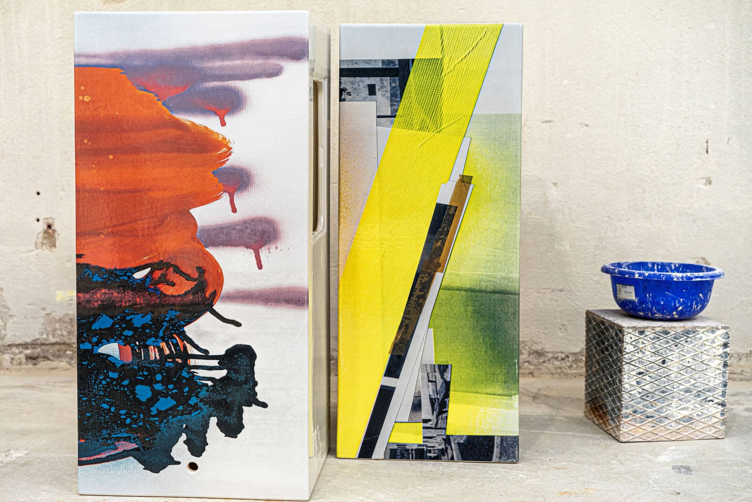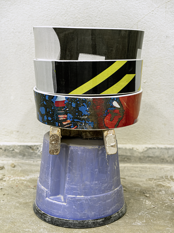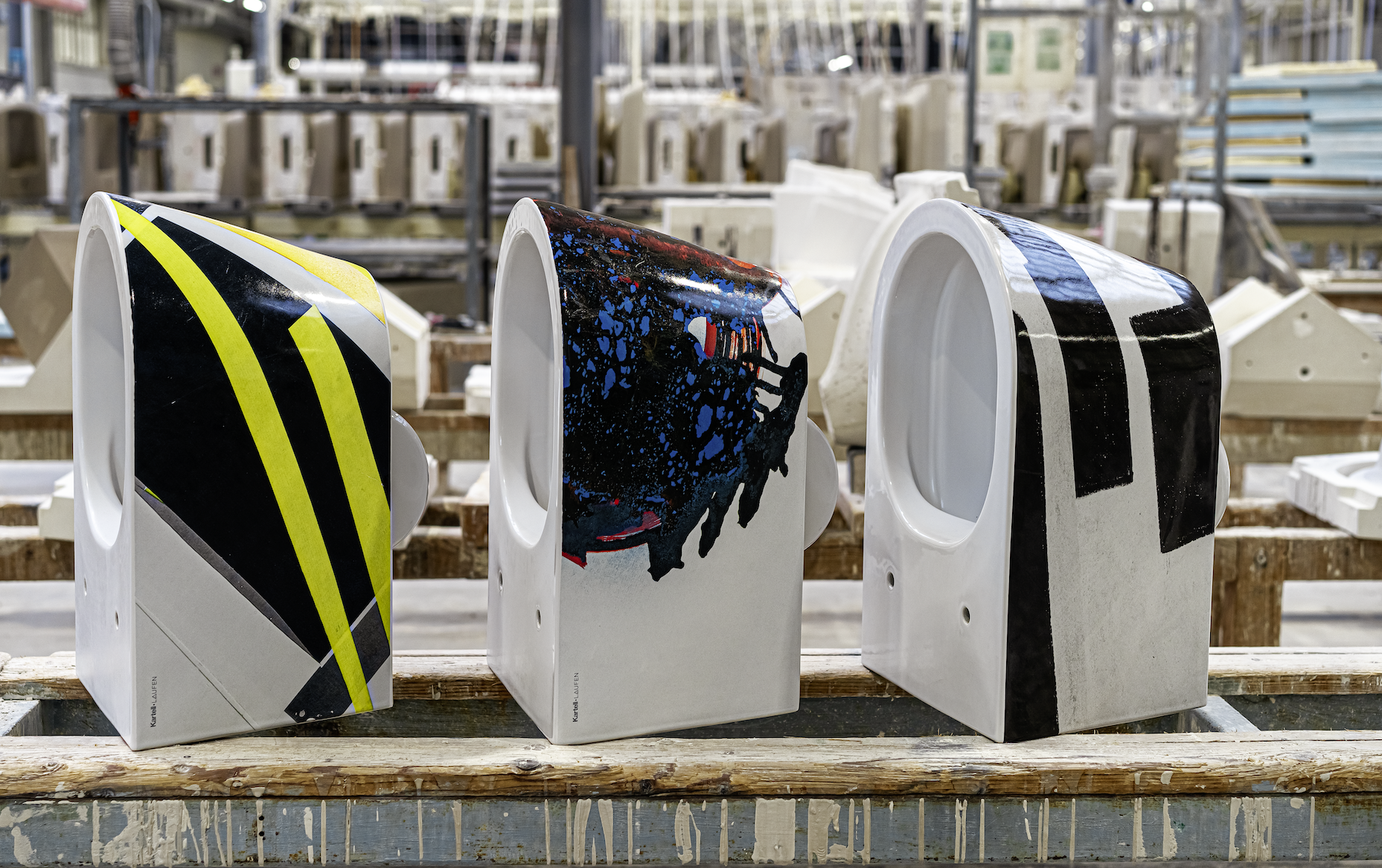 Oprócz tego można zobaczyć pracownię Monique Baumann, szwajcarskiej artystki , która reinterepetuje ikoniczne modele z kolekcji Kartell • LAUFEN używając technik kolażu, malowania oraz rysunku węglem. To kreatywne podejście jest zupełnie inne niż przemysłowe projekty studia NM3.