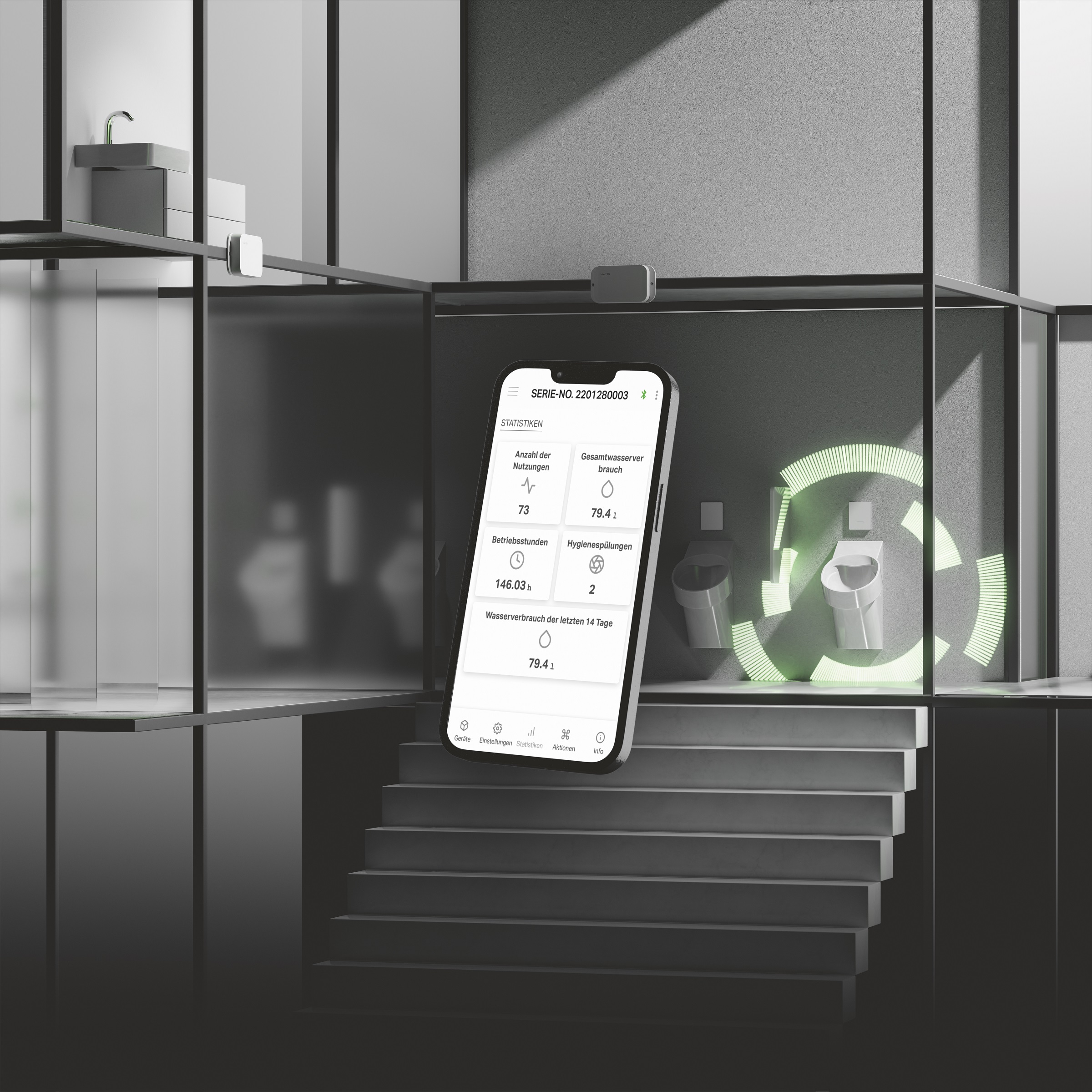 Cyfryzacja pozwala na montaż wyposażenia łazienkowego w strefach toalet publicznych na zupełnie innym nowym poziomie. Inteligentne produkty Laufen zapewniają lepszy standard higieny, zwiększoną wydajność oraz dostawę na najwyższym poziomie. Efektem jest niższe zużycie wody i energii, które redukuje wydatki i jest lepsze dla natury.