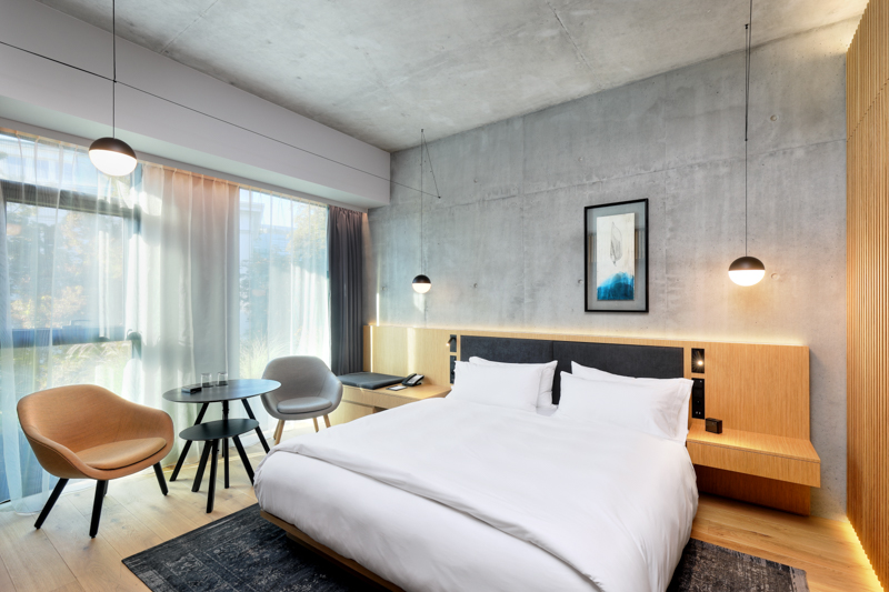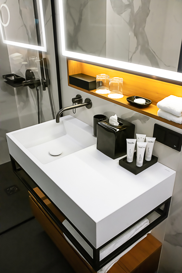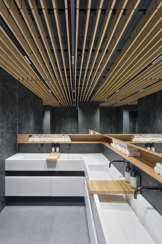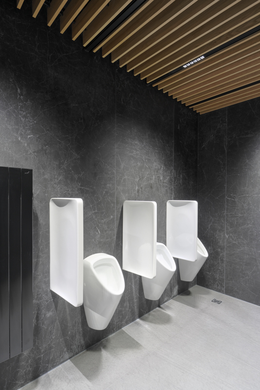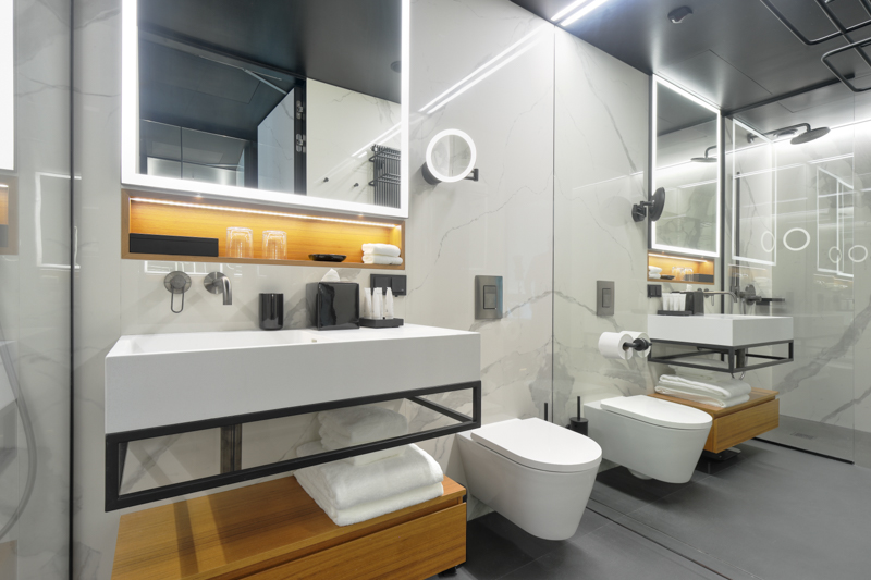 We wnętrzach łazienkowych zastosowano indywidualne rozwiązania najnowszej generacji zgodnie z wizją projektantów i inwestora. Dzięki temu idealnie harmonizują z wystrojem pokojów. W dużej mierze wyposażenie powstało na zamówienie. Za jego stworzenie odpowiada prestiżowa marka łazienkowa LAUFEN. Wszystkie łazienki i toalety są wyposażone w produkty marki Laufen. Umywalki i brodziki w łazienkach pochodzą z kolekcji BESPOKE – to produkty na indywidualne zamówienie, wykonane z materiału Solid Surface. We wszystkich hotelowych łazienkach można zobaczyć również miski WC z kolekcji KartelbyLaufen, a w apartamentach także toaletę myjącą Riva. W toaletach publicznych są z kolei dostępne także pisuary Caprino.